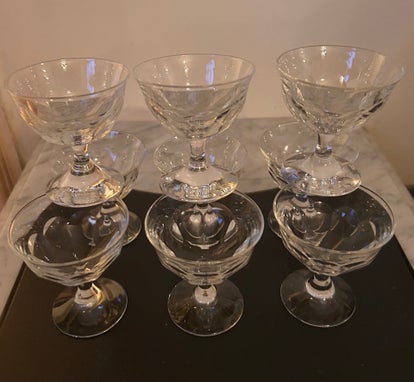 5 stycken rejäla och stabila vinglas på fot i kristall med slipad dekoration. 14cm höga 8cm ø