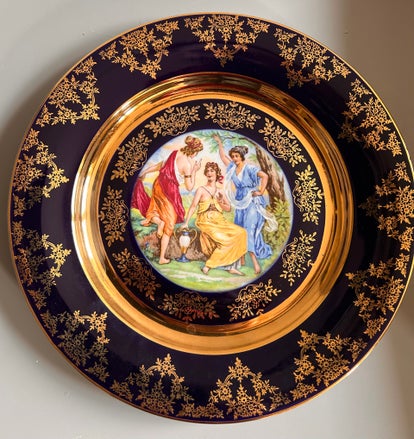 Cobolt blå prydnadstallrik. Med mycket guld med detaljer och antika motiv. 25 cm i diameter.