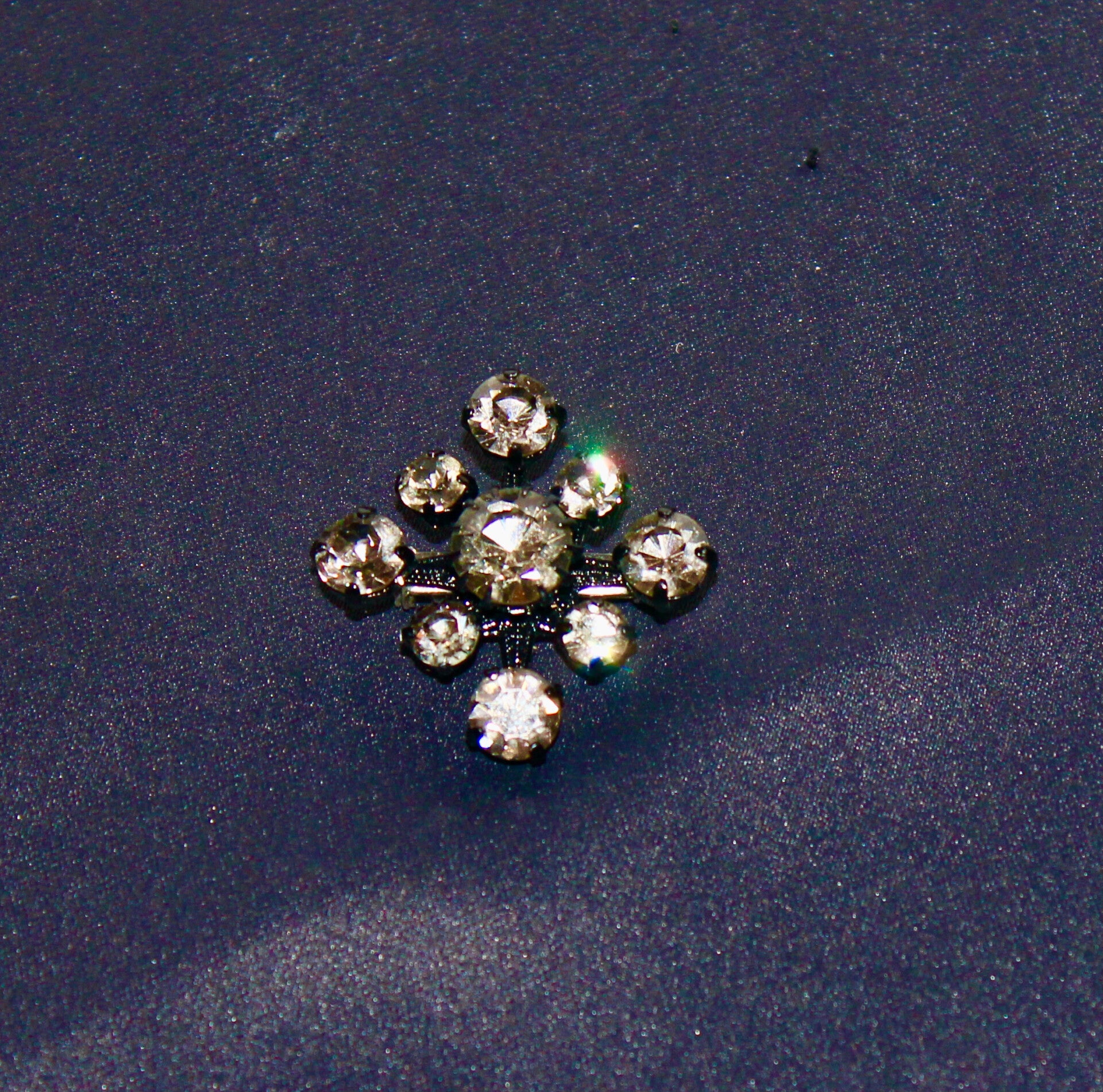 Vacker brosch med slipade vita "stenar" i svart metall infattning.
