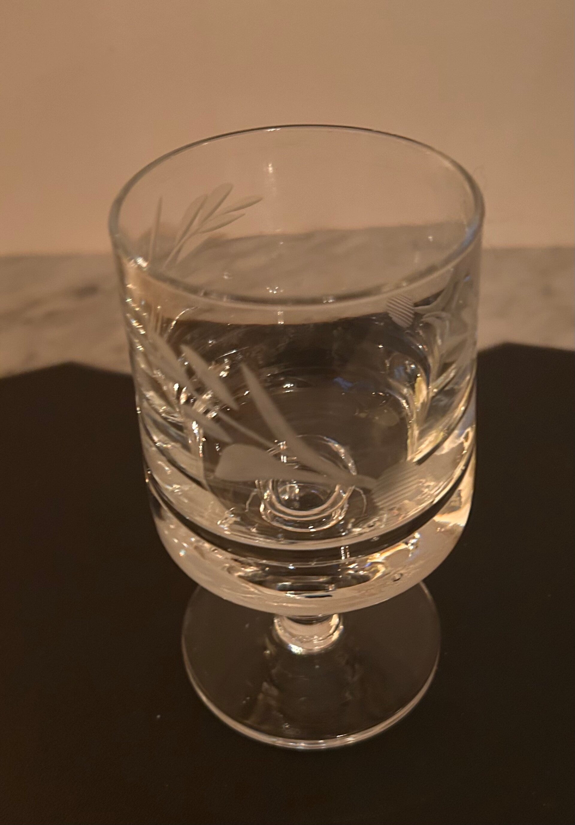 5 stycken rejäla och stabila vinglas på fot i kristall med slipad dekoration. 14cm höga 8cm ø