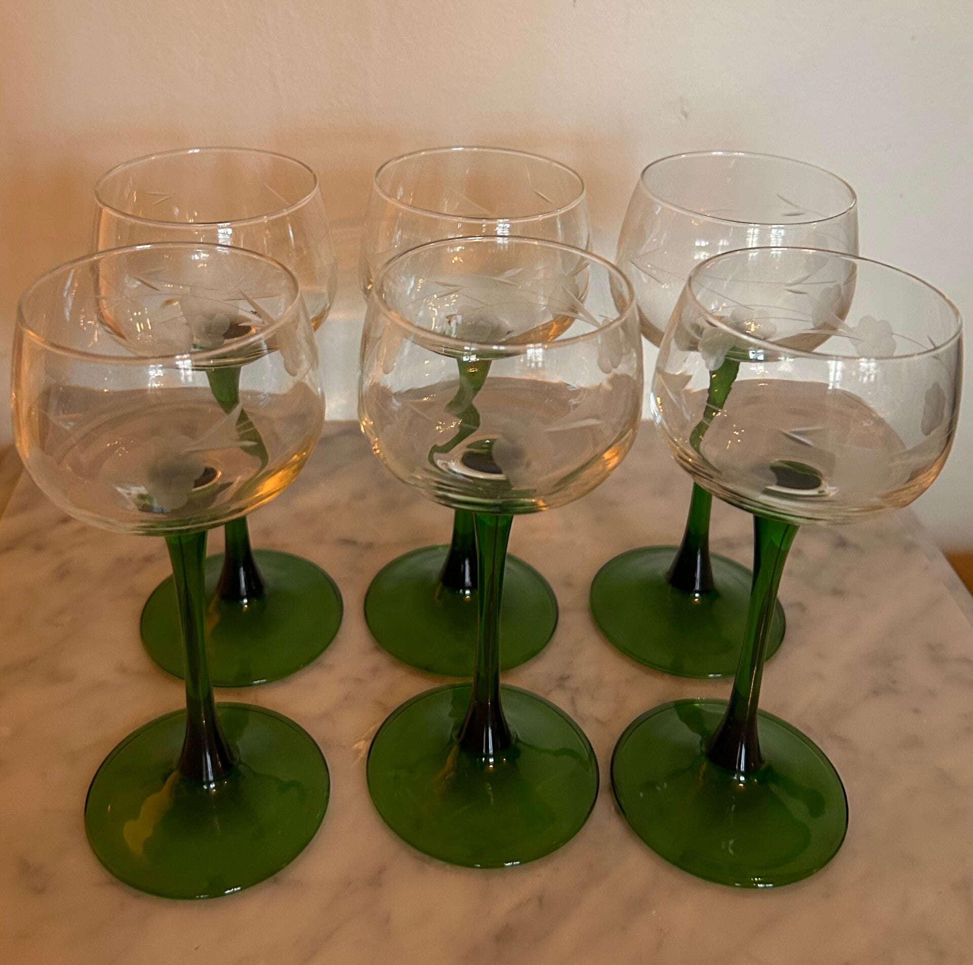6 Remmare/Riesling glas med grön fot och graverad kupa. 16cm långa
