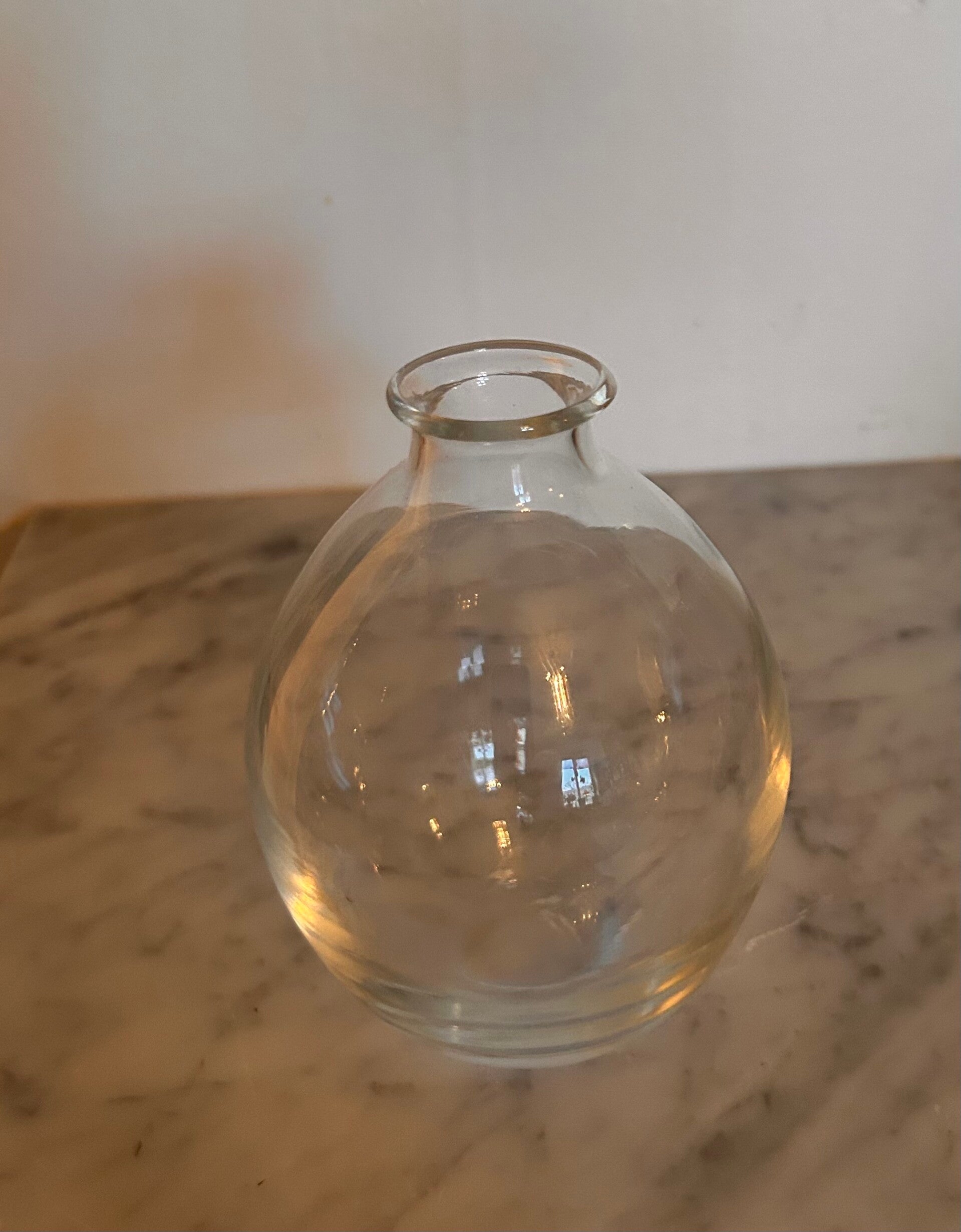 Ovalformad mindre vas i klart glas. 13 cm hög & 10 cm i diameter på mitten