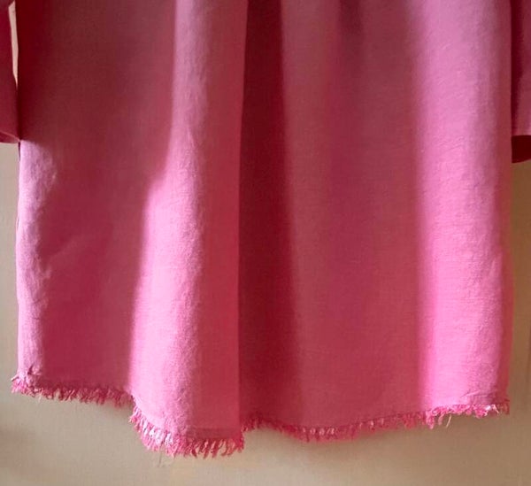 Härlig knälång sommar klänning i rosa bomull. Knäppning framtill. Knapp och band för att kavla upp ärmarna. Storlek S