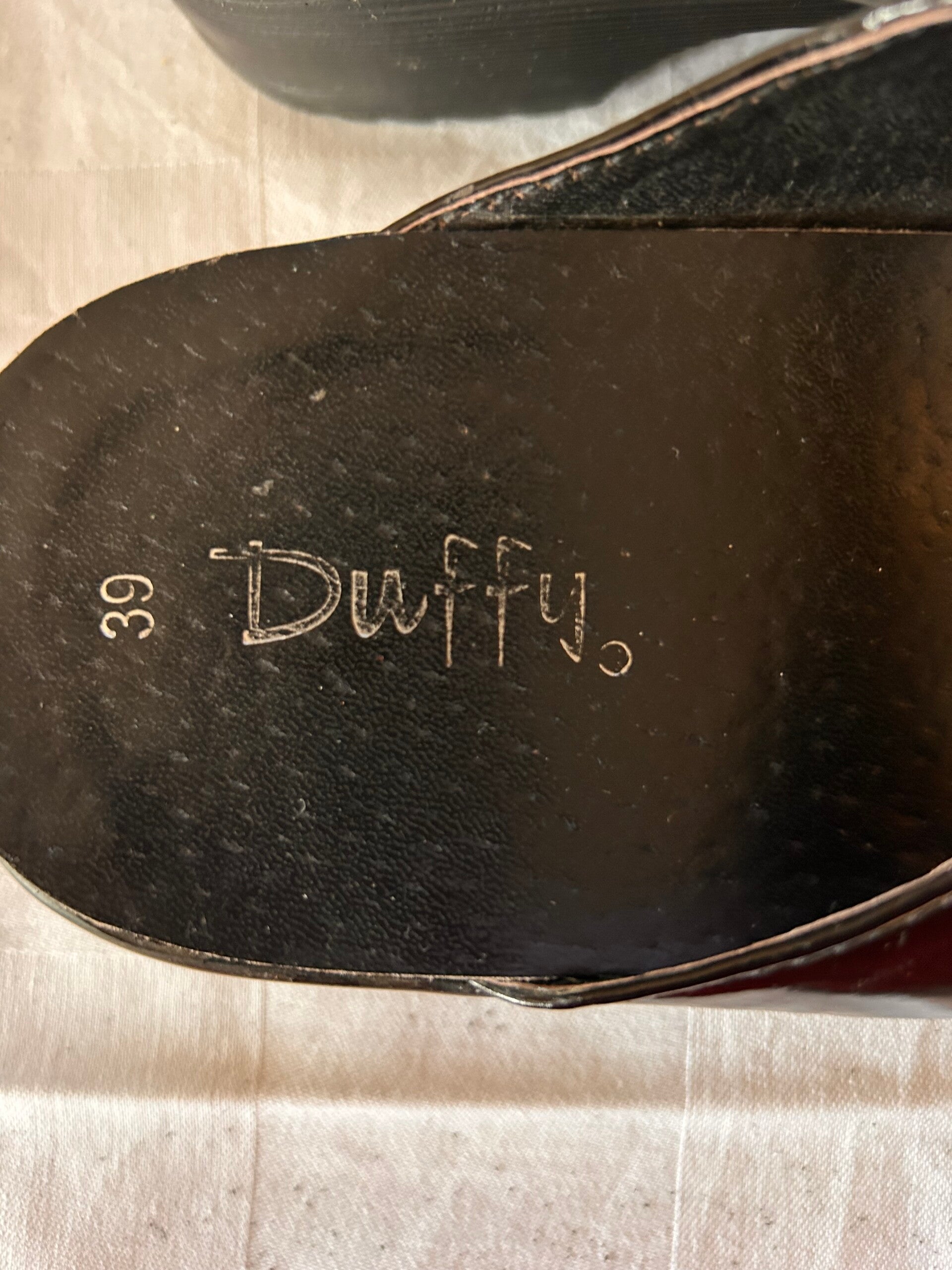 Ett par lackskor med en lätt förhöjd klack från Duffy. Väldigt lite använda, med fin sula. Storlek 39.Modellen är AI genererad med den faktiska skon.