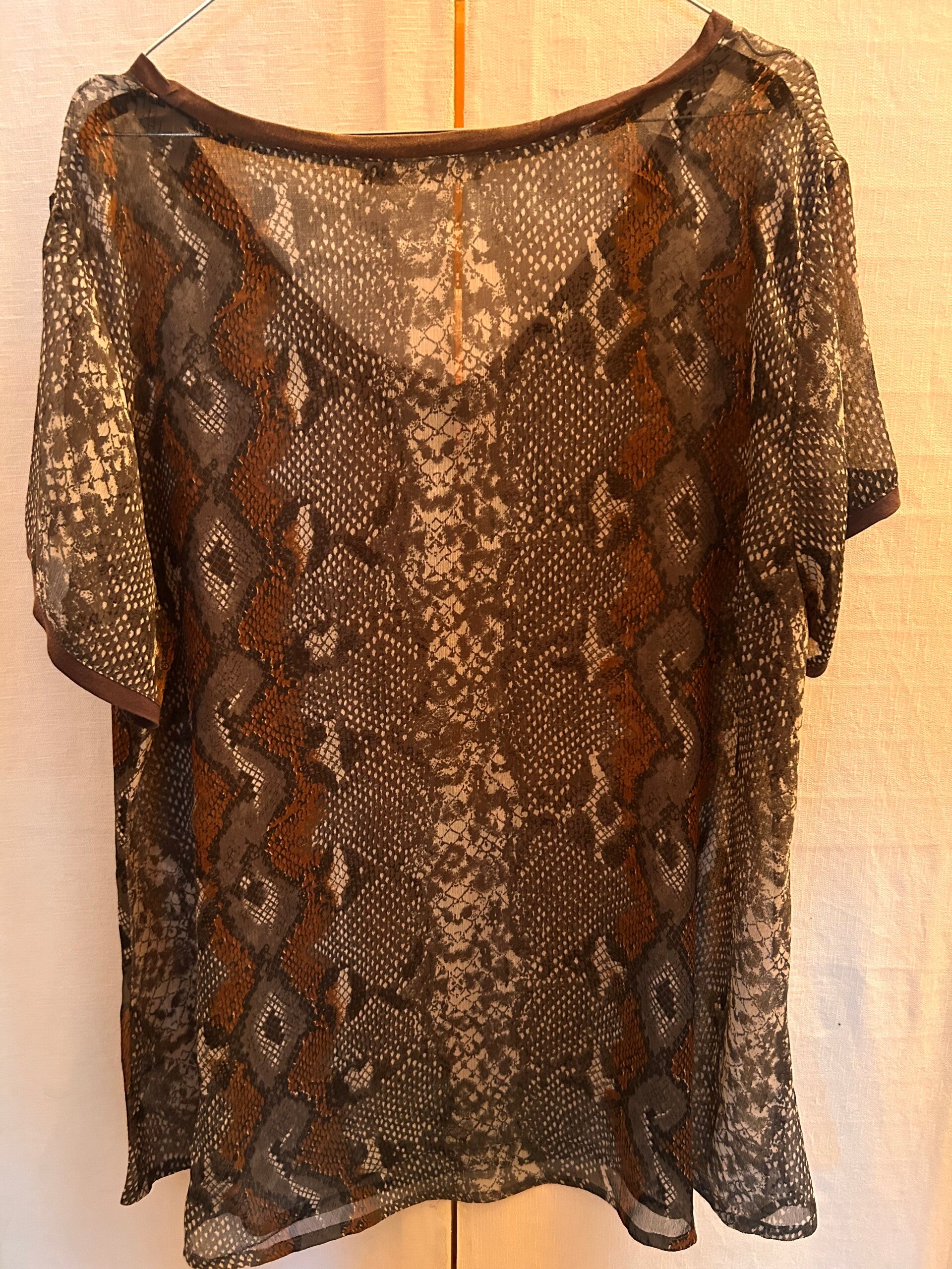 Tunn tunika med reptilmönster. Storlek XLModellen är AI genererad med Det faktiska plagget.