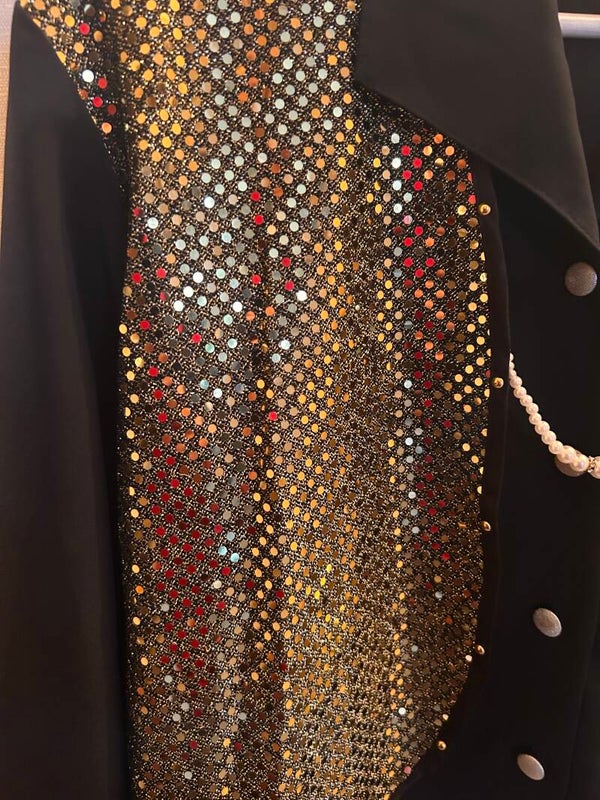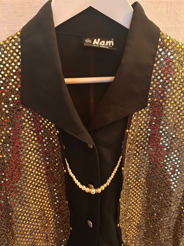 Svart blus och väst med guldpaljetter i ett och samma plagg,länk med pärlor som håller västen på plats. Storlek 42