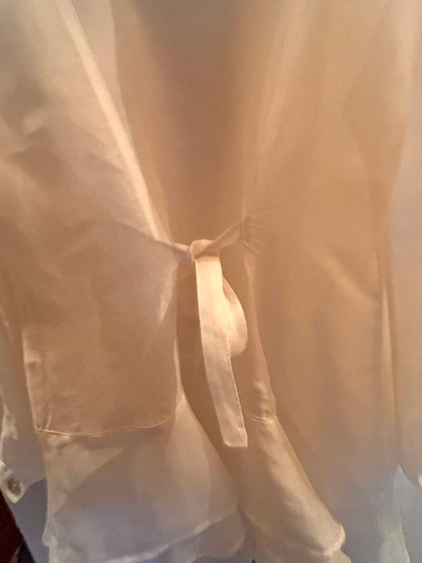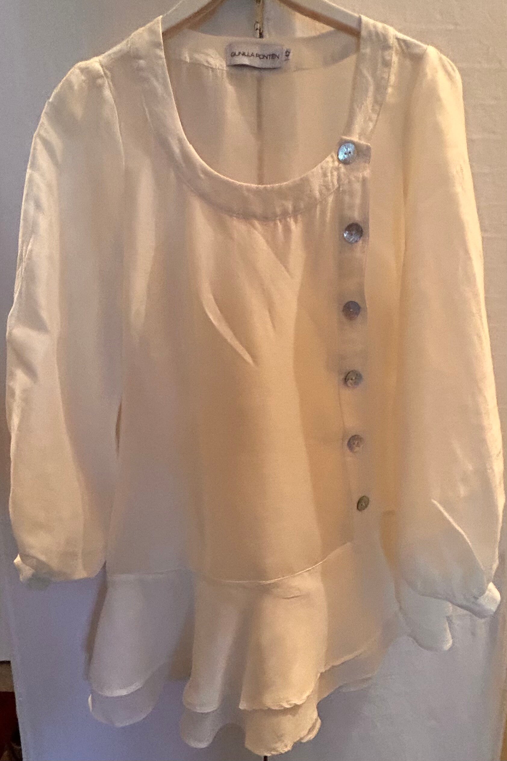 Vit blus / skjorta med volang i siden material, knappar av pärlemor och puffärm av Gunilla Pontén, på ryggen finns band som kan justera storleken. Storlek 42.