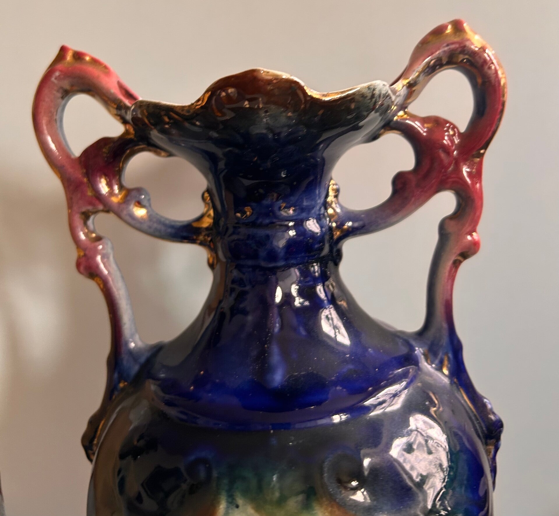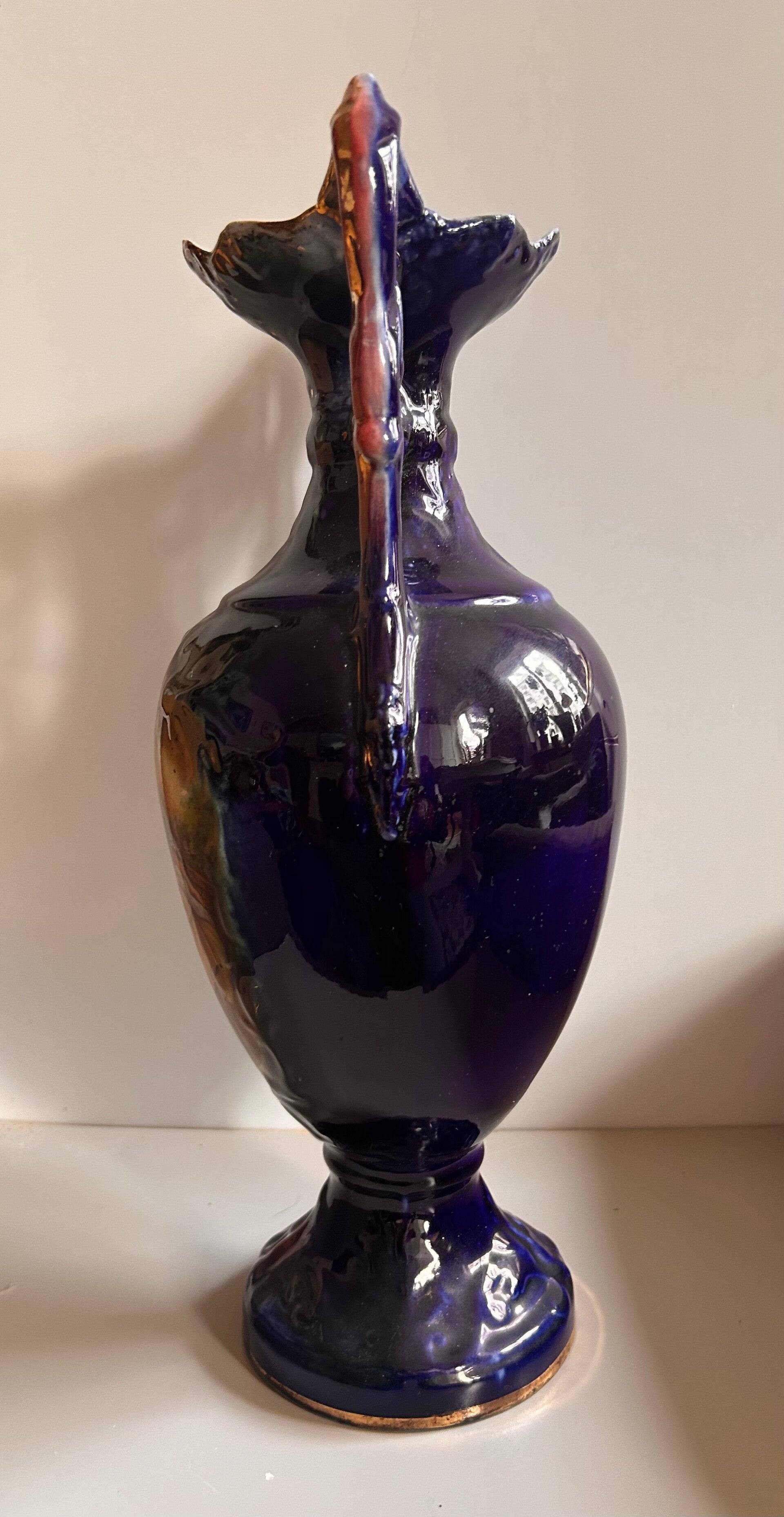 Vacker urna / amfora i koboltblått porslin med motiv från antiken. Passar mycket bra även som vas. 39 cm lång och 19 cm bred på mitten.